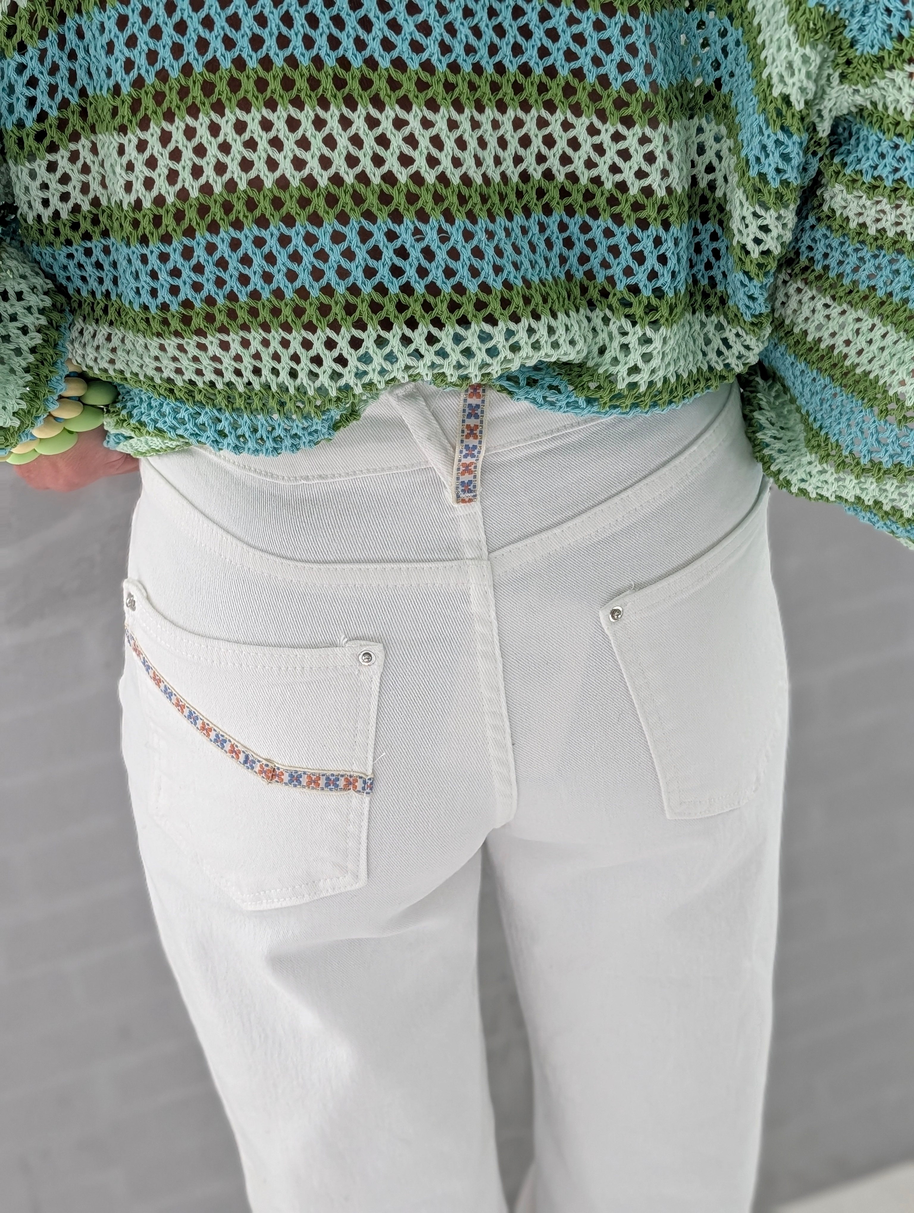 • bunte Webband-Details an den Vordertaschen